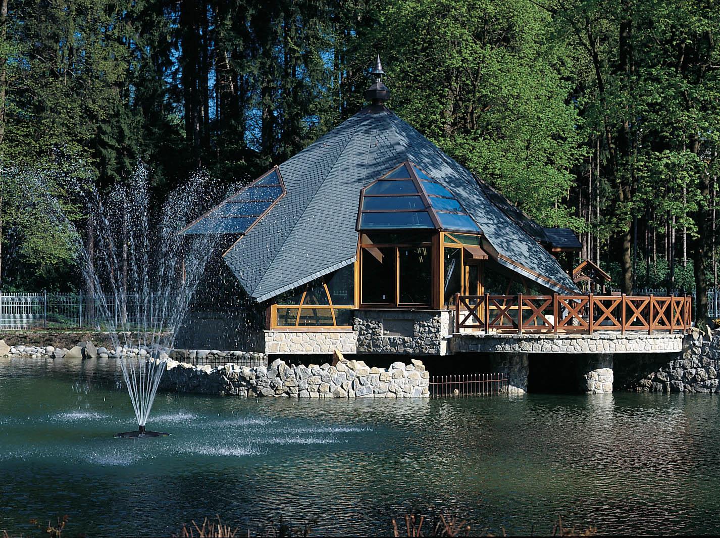 - Venkovní termální areál: venkovní termální areál: sedací kruhový bazén, bazén s vodopádem,