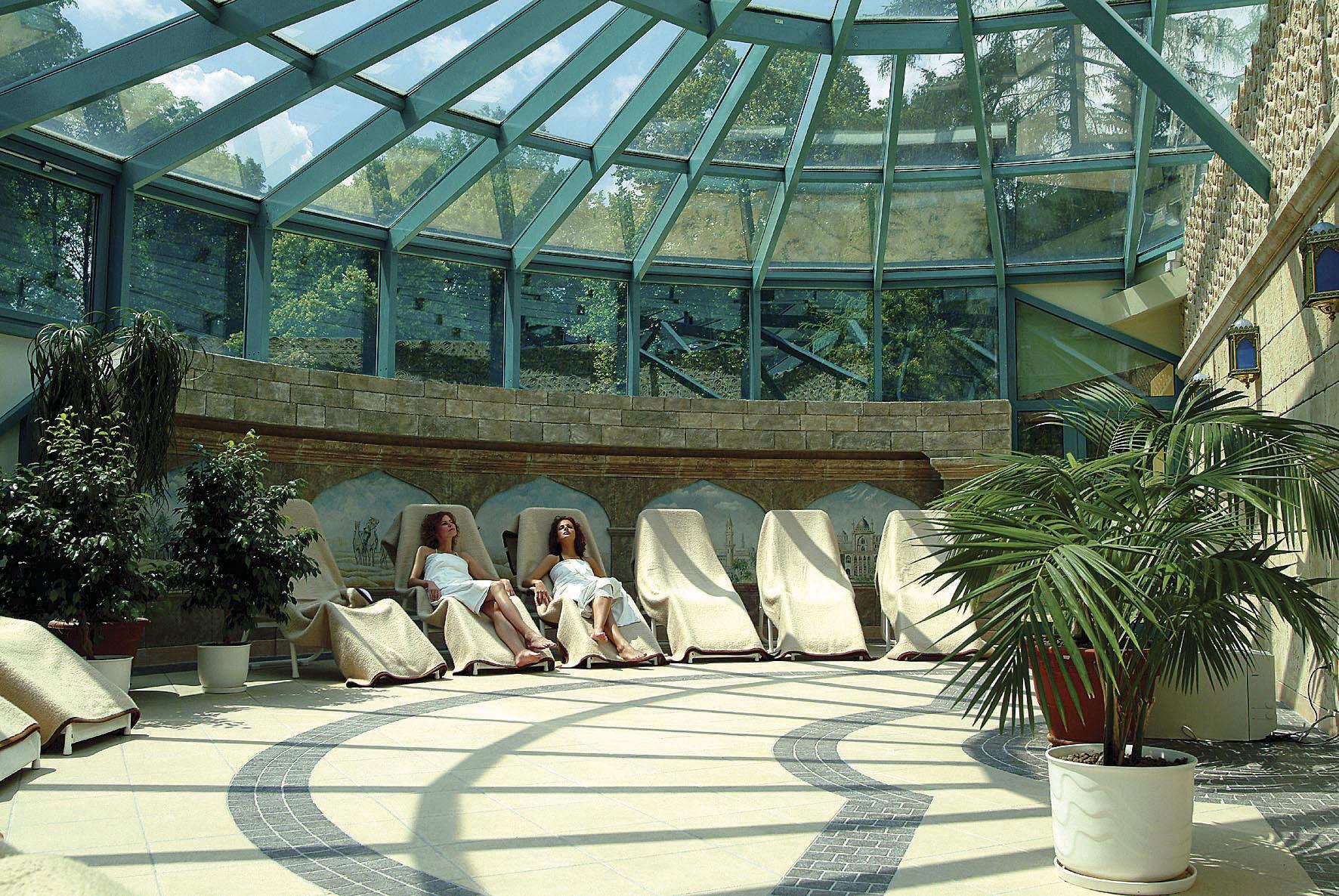 Dva vnitřní termální bazény - sedací klidový s termální léčivou vodou o teplotě 37-38°C a větší rehabilitační/plavecký bazén s teplotou vody 30-32°C, který je určen pro pohybové aktivity a je možné v něm využít k masírování těla vodních trysek, masážního vodního lůžka nebo chrliče, Venkovní termální areál – sedací kruhový bazén, bazén s vodopádem, 2 bazény tureckých lázní a plavecký bazén, 2 venkovní srubové sauny. Saunový svět (finská sauna, parní sauna, bylinová sauna, infrasauna) má velkou odpočívárnu s lehátky, relaxační hudbou a prosklenou střechou. V hotelu můžete absolvovat mnoho lázeňských a relaxačních procedur. Ubytovaní hosté mají volný vstup do bazénů, saun a fitness centra.